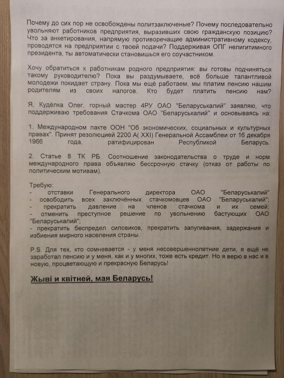 Позже на связь со стачкомом вышла жена рабочего, объявившего протест, и передала его требования. Начинается обращение со слов «недорогой и уже неуважаемый мной директор». Мужчина написал, что с Иваном Головалым, руководителем «Беларуськалия», они учились рядом – в Санкт-Петербургском университете горняков. И когда-то он этим гордился. Далее он пояснил, почему уже нет, и обратился к своим коллегам, задав им вопрос: «готовы ли подчиниться такому руководителю?».