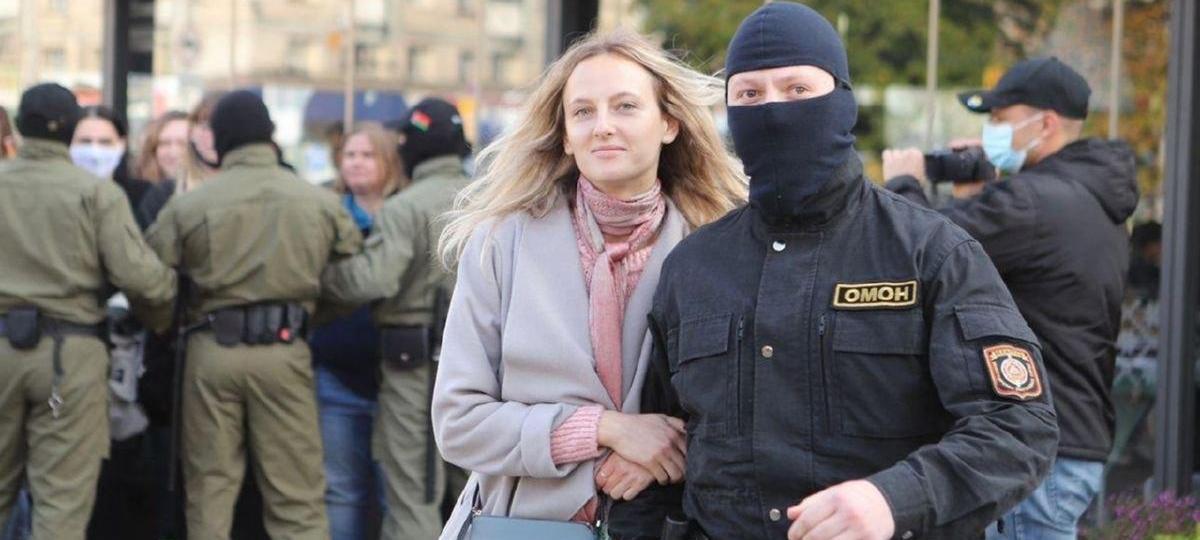 Веронике Хоружей 26 лет. Она копирайтер. По дороге в автозак девушка предложила омоновцу, который вел ее к машине, взять его под руку — и гордо прошла с ним по нужному маршруту. Об идее видоизменить привычную для белорусов сцену задержаний говорит так: «Все вышло спонтанно», пишет TUT.BY .