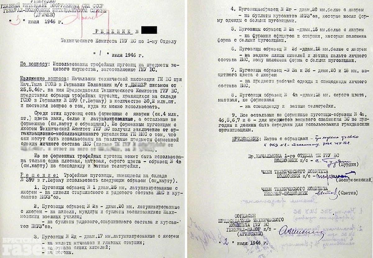 Этот документ, утвержденный главным интендантом вооруженных сил СССР генерал-полковником Драчевым от 3 июля 1946 года, был опубликован на одном историческом интернет-ресурсе. В нем говорится, что в мае 1946 на складе в городе Бернау (Германия) было обнаружено 4 млн немецких пуговиц с якорем. Далее идет их описание и предложение использовать в ВМФ Советского Союза. Согласно параметрам пуговицы, найденной в крепости, такие было предложено шить на бушлаты воспитанникам Нахимовского училища. И, вероятнее всего, это было исполнено.