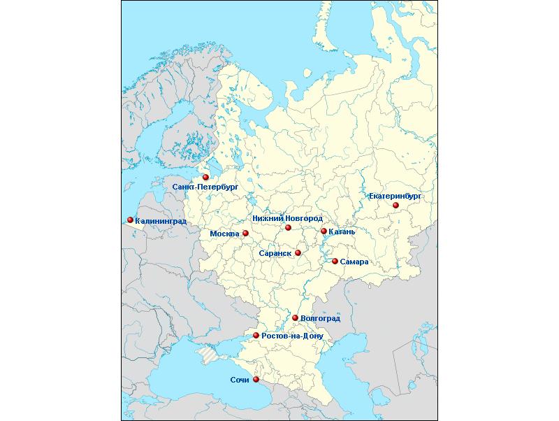 Чемпионат мира по футболу пройдет с 14 июня по 15 июля на 12 стадионах в 11 городах России: Москве, Санкт-Петербурге, Казани, Сочи, Самаре, Нижнем Новгороде, Ростове-на-Дону, Саранске, Калининграде, Екатеринбурге и Волгограде.